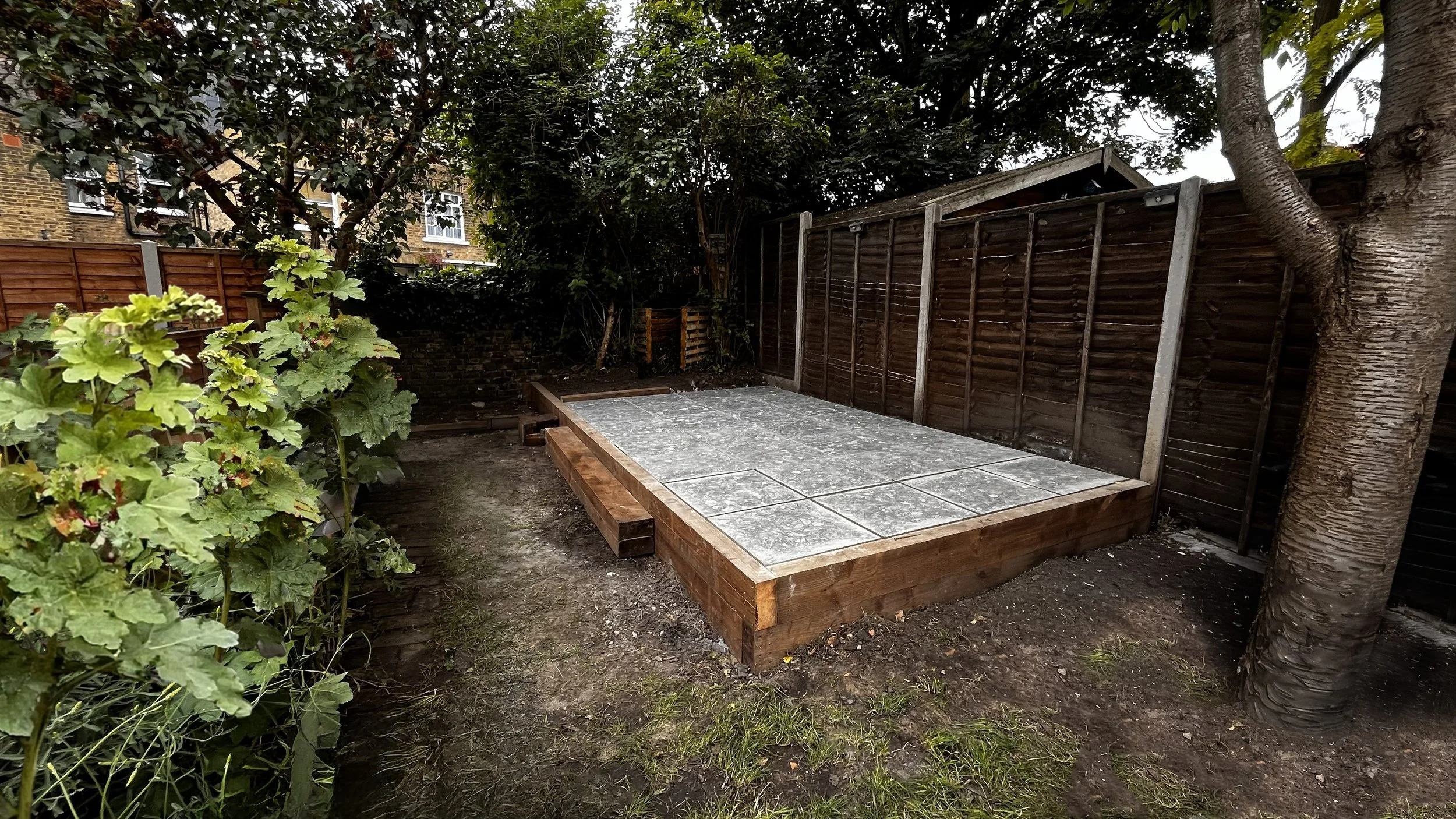 This small London garden had literally been lost to the foxes, who had buried under the once wooden decked ‘terrace’, and left the owner mildly worried about spending time in their garden. It was time to reclaim the terrace! The garden was at the back of a line of Victorian terraced houses with the only access being through the neighbours flat, so roughly 4 tons of type 1, sand and concrete was carried through their house, along with sleepers, a cement mixer, and with their very kind permission of course! We removed all the old rubble, mounted the sleepers on type 1 for drainage, and back filled 100mm of type 1 before laying the patio on 50mm of mortar. The client was overjoyed to once again find a little bit of sanctuary in our glorious capital city.
