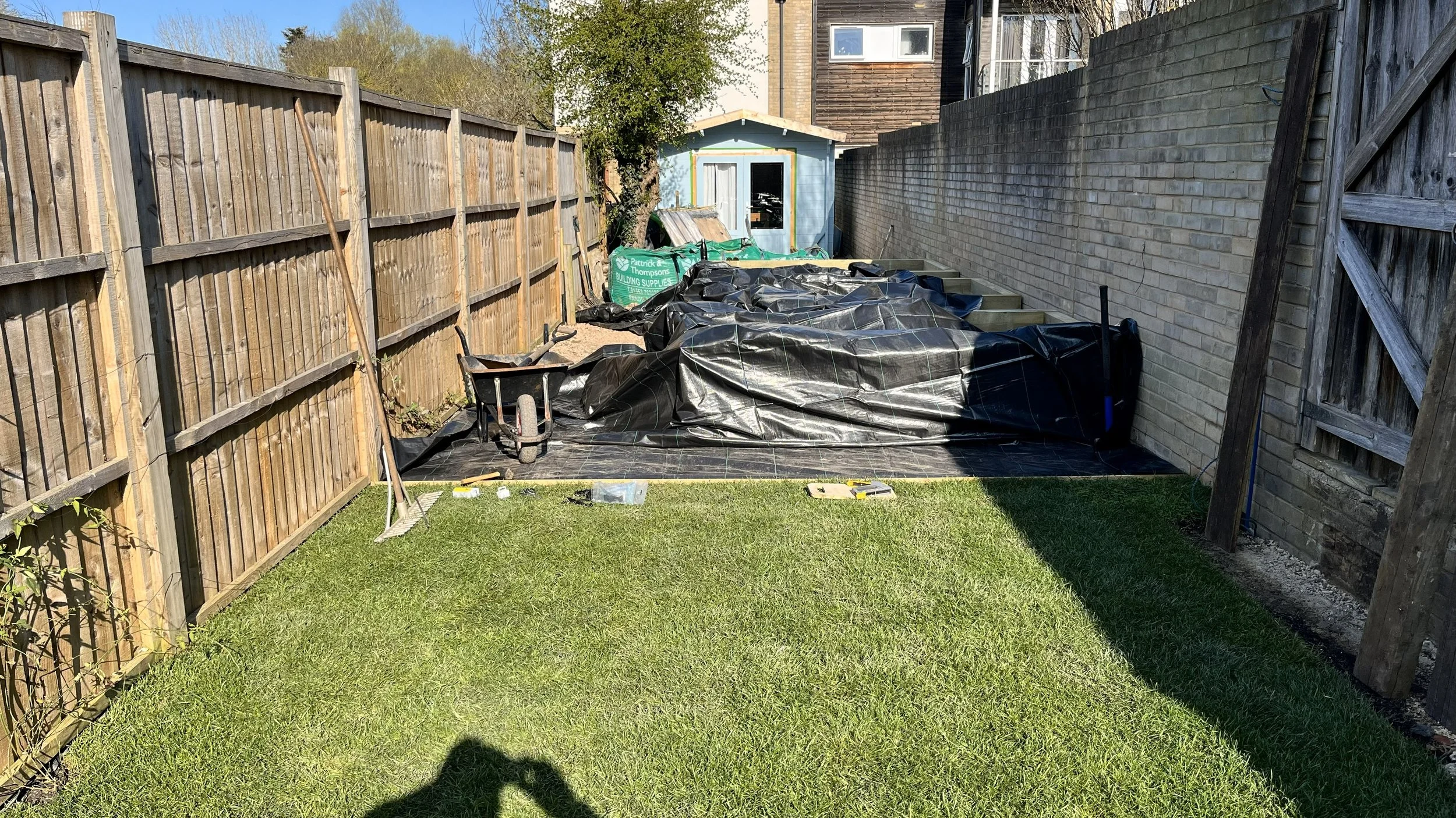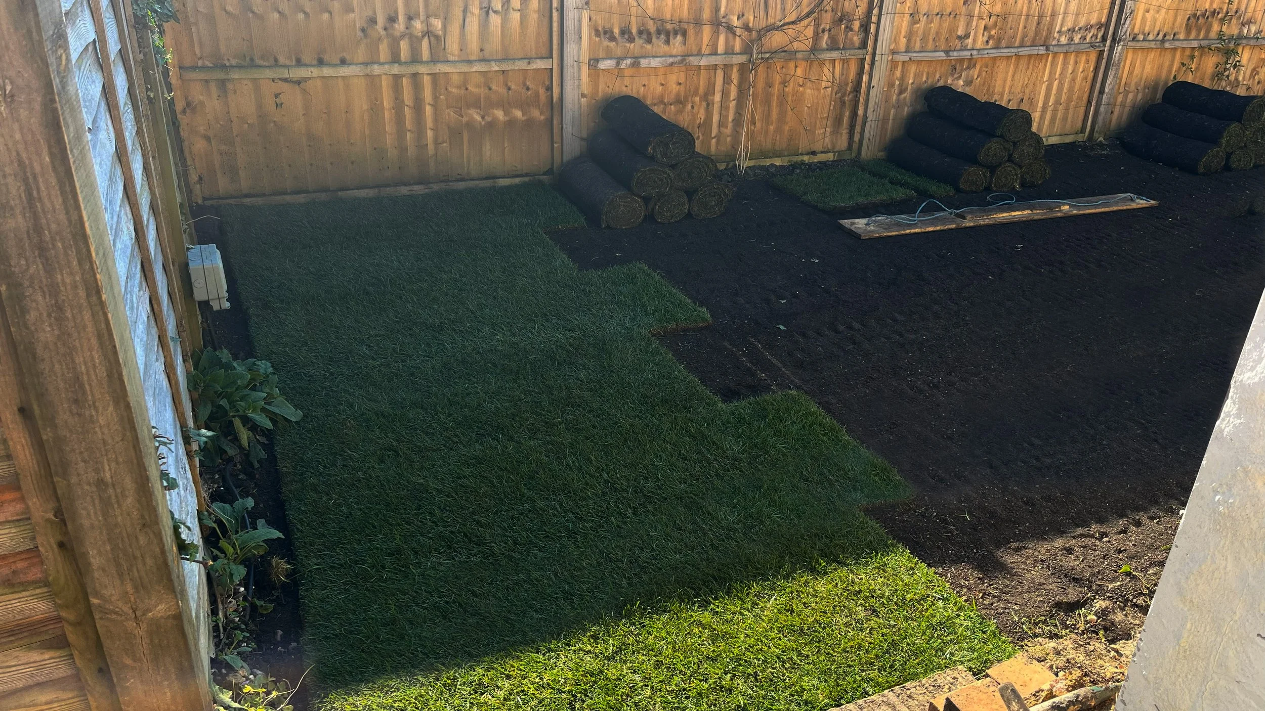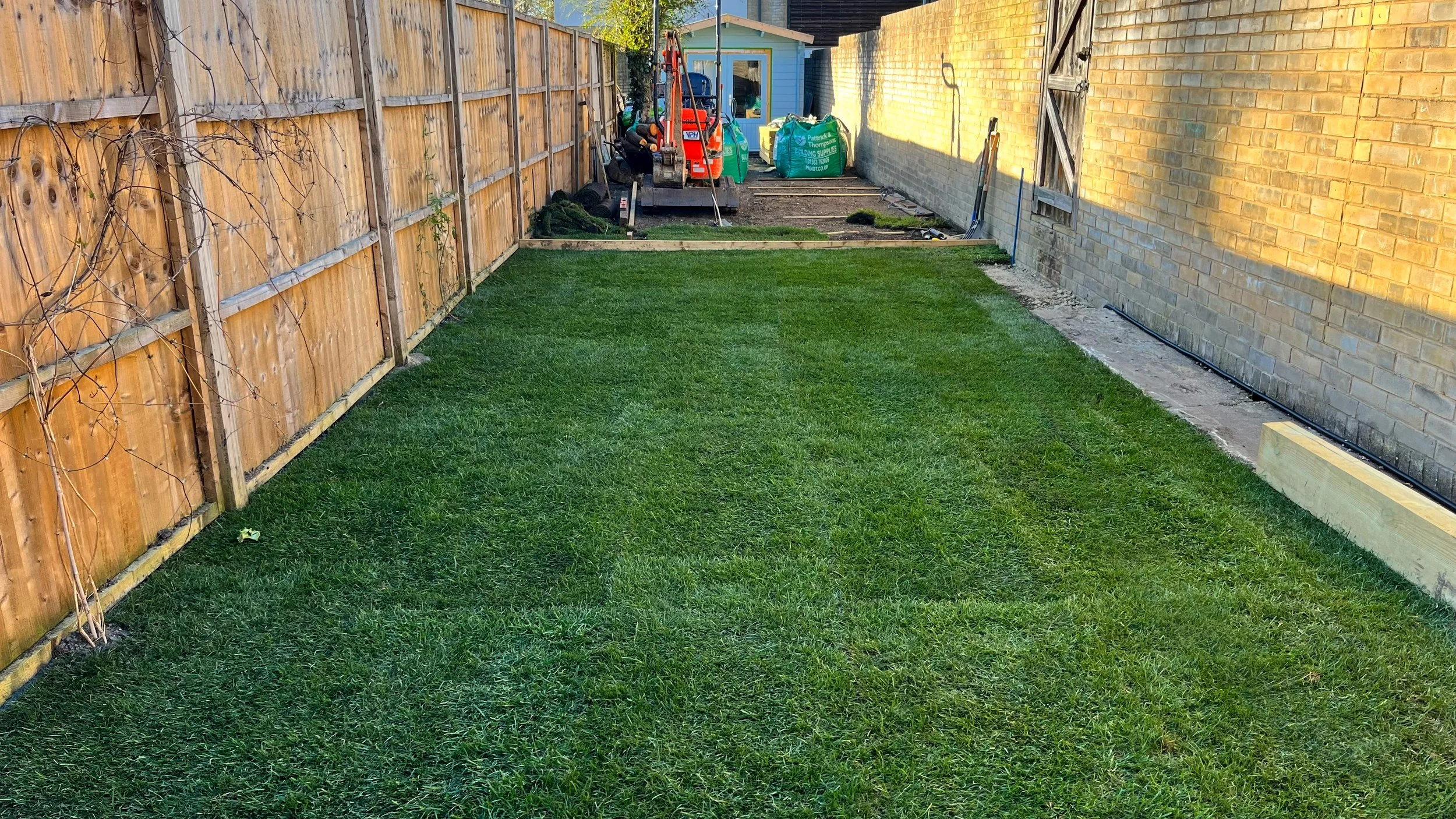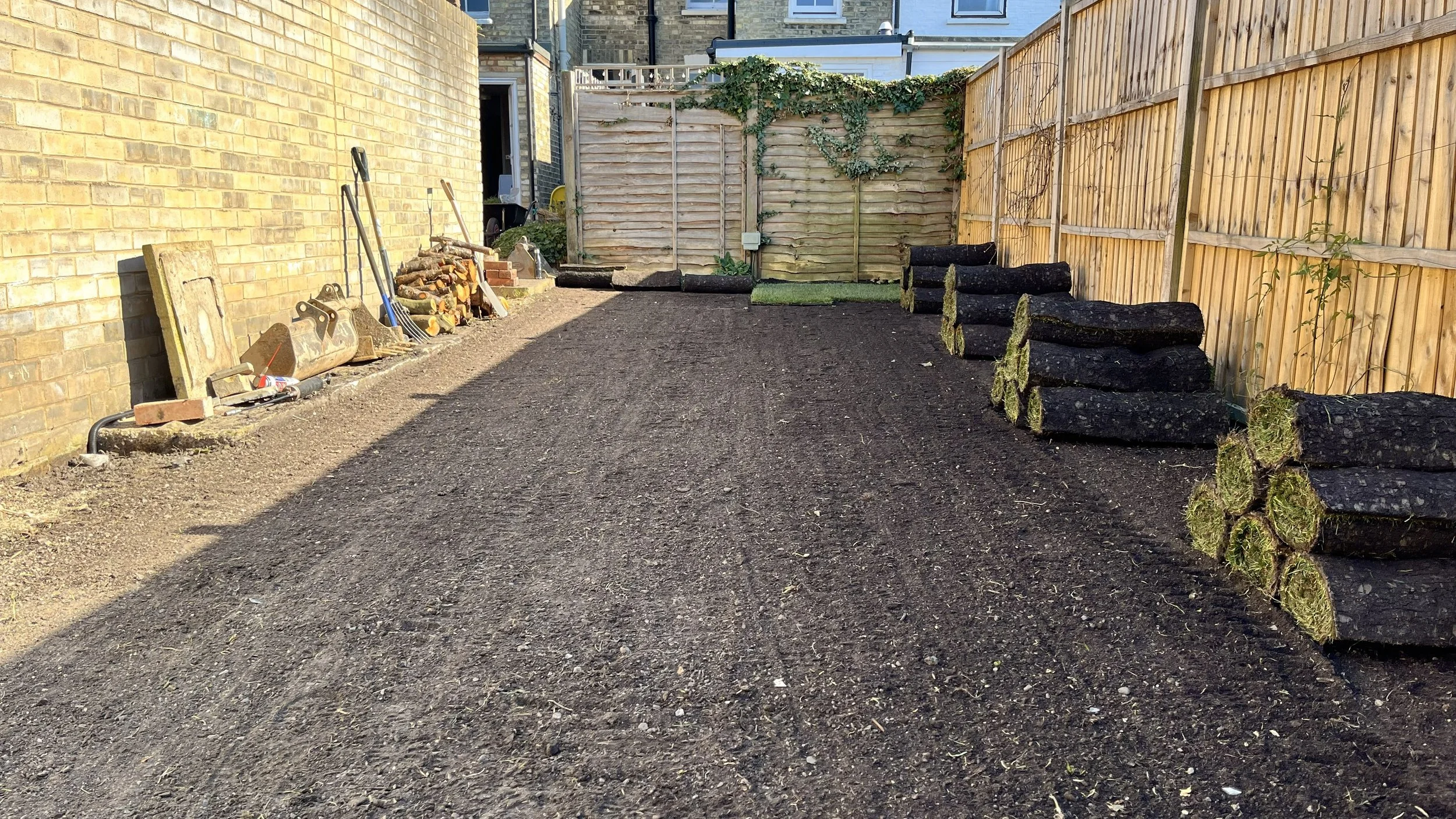 Section one, closest to the house, was to be put to lawn with a raised border along the wall, incorporating a set and storage area. We brought in 1.5 tons of topsoil with which to enrich the lawns foundation and give us a perfect bed to lay on. The lawn took in a matter of days due to a very warm few days in March.