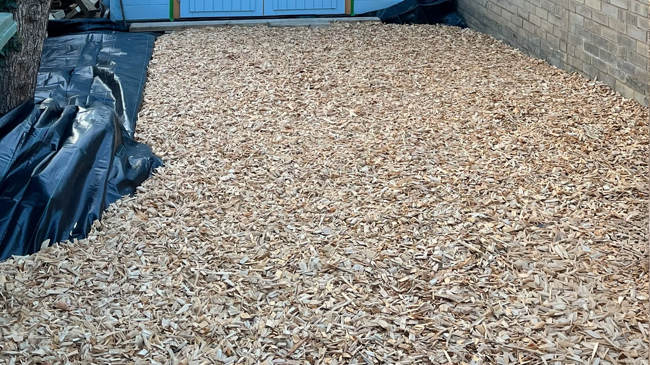 The final section, closest to the studio office encompassed a lovely old Hawthorn which had been cut back the previous winter, this still created a bit of shade along with the large boundary wall. For this section we used a stunning light woodchip, and a single sleeper raised border which was to be planted with ferns. Alongside this we built a simple base for a shed which was to be painted with a matching colour scheme to the studio office.