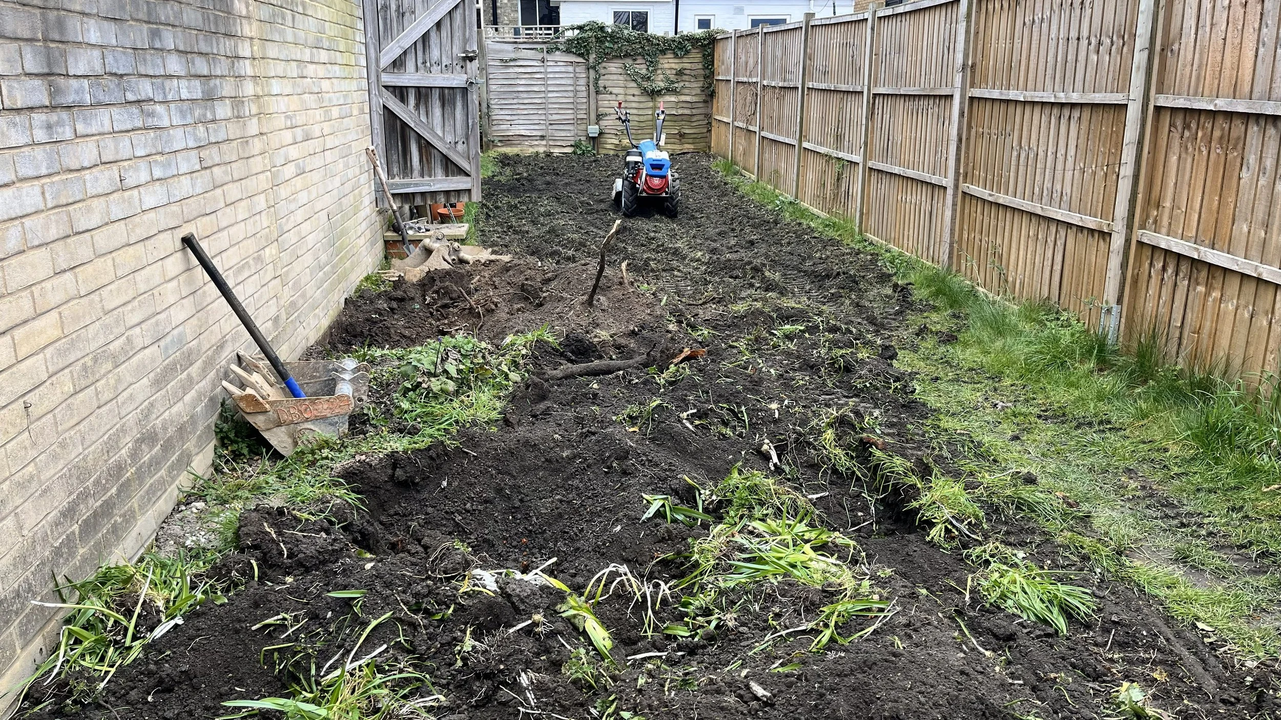The first thing was to clear the site, so out came the diseased cherry and the overgrown Ceonothus that was now heavily leaning into the centre of the garden. Using the micro digger we dug out the roots, and then brought in the rotovater to turnover the site and begin to get things levelled out. Using the dozer blade on the digger and plenty of raking we finally had the site cleared and level.